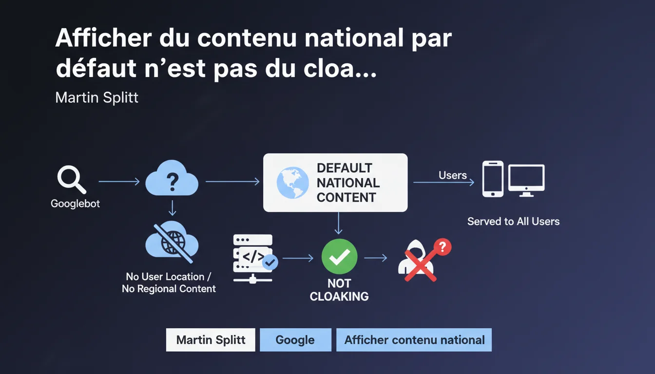 Google confirme qu'afficher du contenu national par défaut lorsqu'on ne peut pas déterminer la localisation d'un utilisateur (ou qu'on n'a pas de contenu pour sa région) n'est pas considéré comme du cloaking, à condition que Googlebot reçoive le même traitement. Cette clarification lève une ambiguïté majeure pour les sites multi-régionaux qui proposent une expérience de repli neutre.