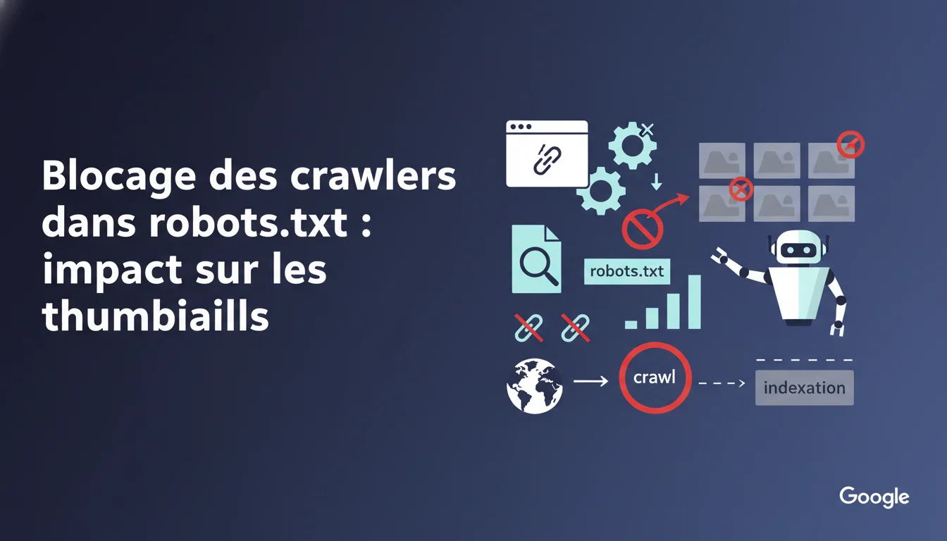 Bloquer l'indexation des images via robots.txt ou en-têtes HTTP empêche Google de crawler le site et d'accéder aux données structurées. Cela empêche l'affichage des images dans la recherche d'images ET des thumbnails dans les résultats web normaux.