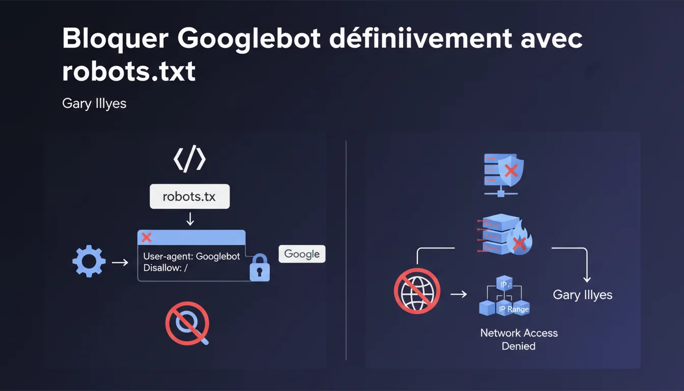 Google confirme deux méthodes pour bloquer Googlebot : une règle disallow / dans robots.txt pour empêcher l'exploration, ou des règles de pare-feu bloquant les plages IP officielles pour couper l'accès réseau complet. La première méthode stoppe le crawl, la seconde empêche toute connexion.