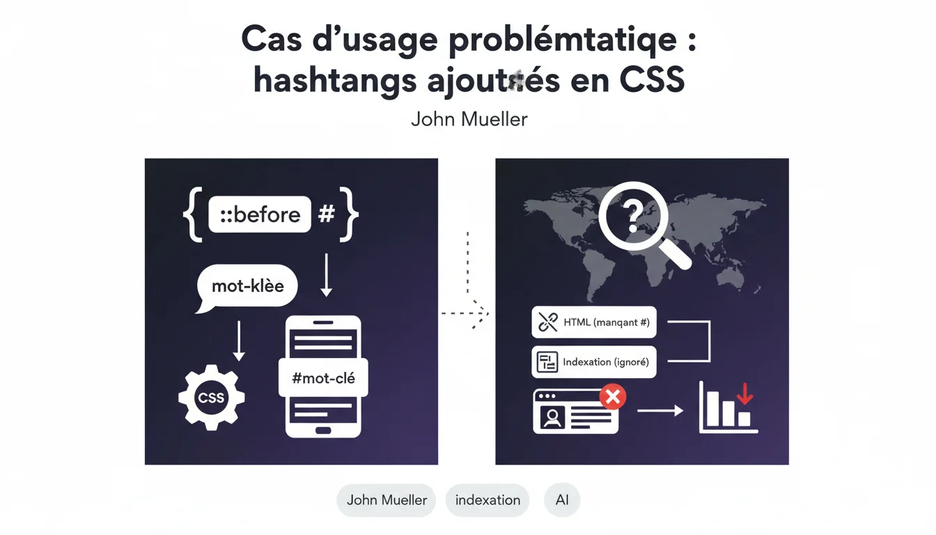 Google a identifié un cas problématique : un site ajoutait des hashtags (#) via CSS ::before devant des mots-clés, et le système d'indexation ne les reconnaissait pas. Le symbole # n'étant pas dans le HTML source mais généré visuellement par CSS, il devient invisible pour Googlebot. Cette pratique revient à tenter de manipuler l'affichage sans modifier le contenu réellement indexable.