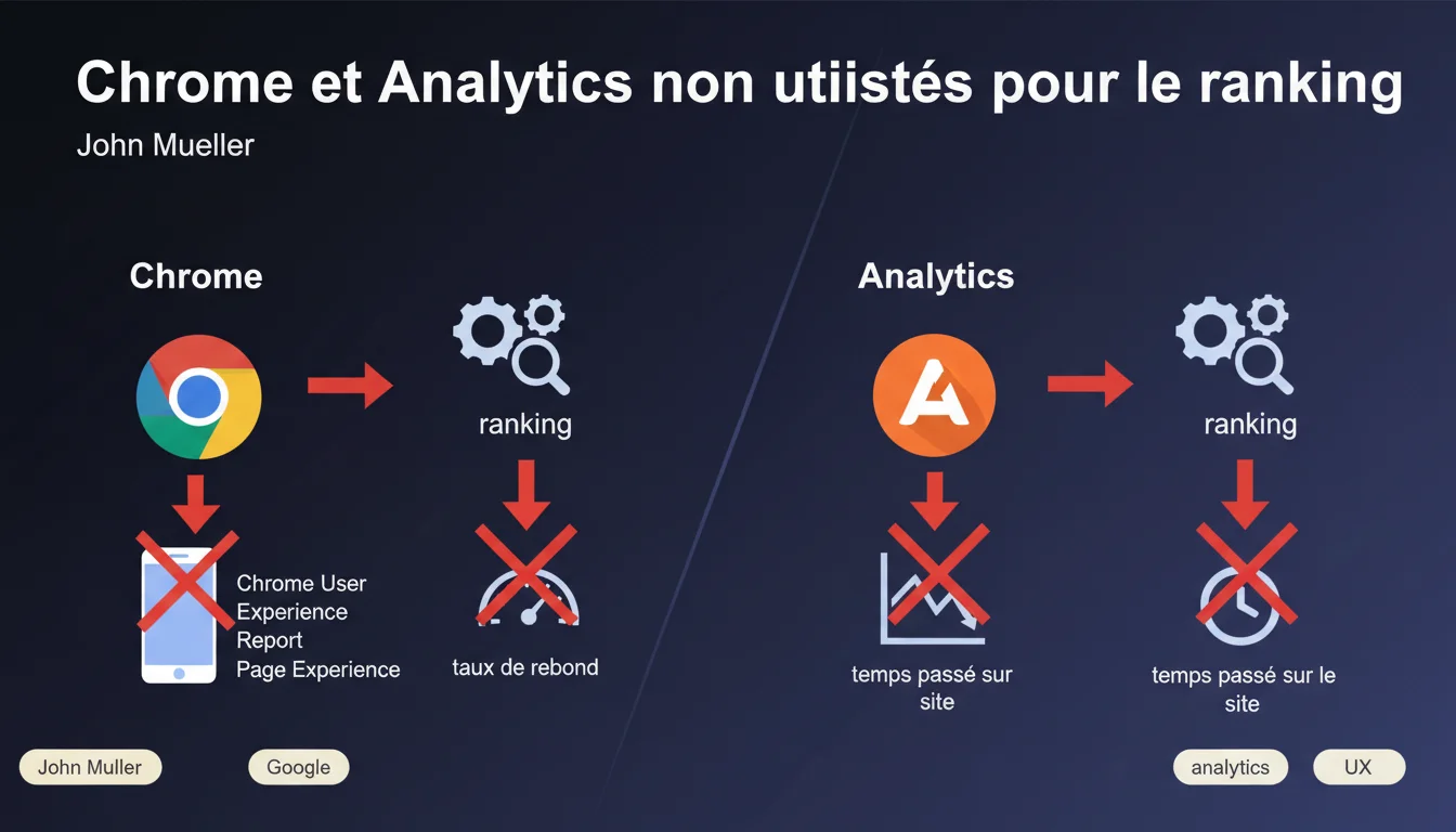 Par ailleurs, rien n'empêche Google d'utiliser des signaux comportementaux captés directement dans les SERP (taux de clic, pogo-sticking, temps avant retour à la recherche). Ces métriques-là ne passent ni par Chrome ni par Analytics — et Mueller n'en parle pas ici.