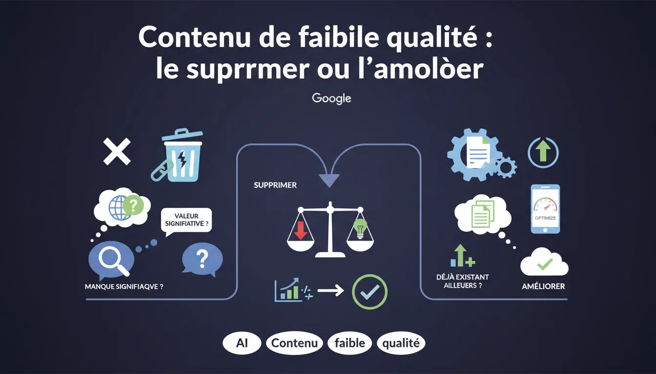 Google recommande explicitement de supprimer ou d'améliorer les contenus de faible qualité. La question centrale : ce contenu apporte-t-il une valeur unique ou n'est-il qu'une redite de ce qui existe déjà ? Cette position confirme que la simple accumulation de pages n'a aucune valeur — et peut même nuire au classement global du site.