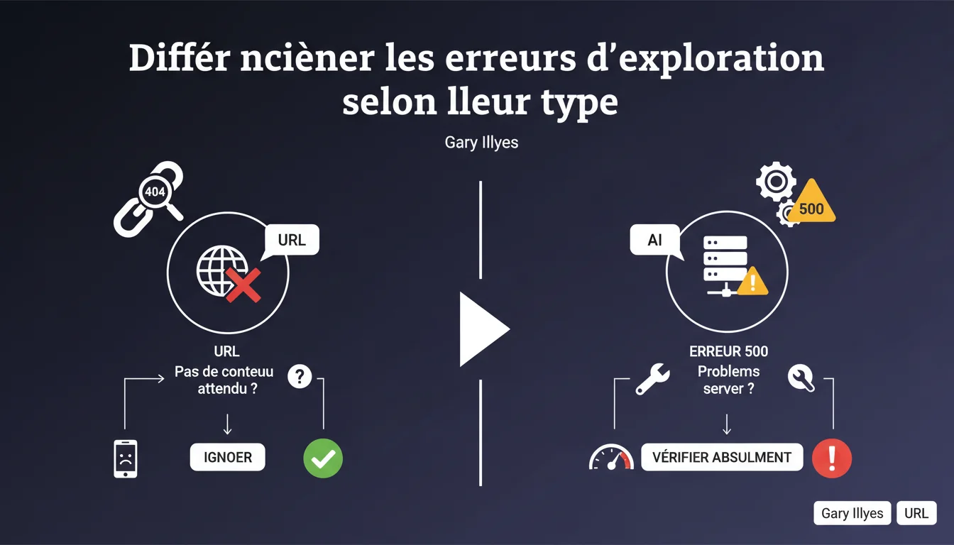 Google distingue clairement les erreurs 404 (généralement bénignes si l'URL n'a pas de raison d'exister) des erreurs 500 (critiques car elles signalent un dysfonctionnement serveur). Les 404 peuvent être ignorées dans la plupart des cas, tandis que les 500 nécessitent une intervention immédiate car elles bloquent l'exploration et peuvent impacter l'indexation.