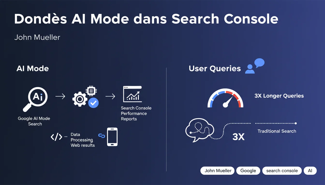 Les données de l'AI Mode sont déjà trackées dans la Search Console, sans distinction spécifique. Le changement majeur : les requêtes sont trois fois plus longues qu'en recherche classique. Ça redéfinit la donne sur l'intention de recherche et la manière dont vous devez cibler vos contenus.