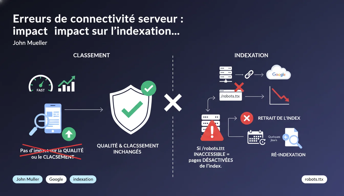Les problèmes de connectivité serveur n'impactent pas directement votre classement, mais peuvent faire disparaître vos pages de l'index si Google ne peut pas accéder au robots.txt pendant une période prolongée. La réindexation prend généralement quelques jours après résolution du problème — ce qui signifie quand même une perte de visibilité temporaire.