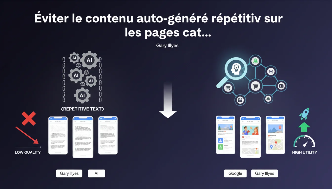 Gary Illyes parle de « textes auto-générés répétitifs », pas de contenu structuré. Une FAQ spécifique à une catégorie, des filtres enrichis avec descriptions, des snippets d'avis clients — tout ça, c'est du contenu, mais ce n'est pas du texte de remplissage.