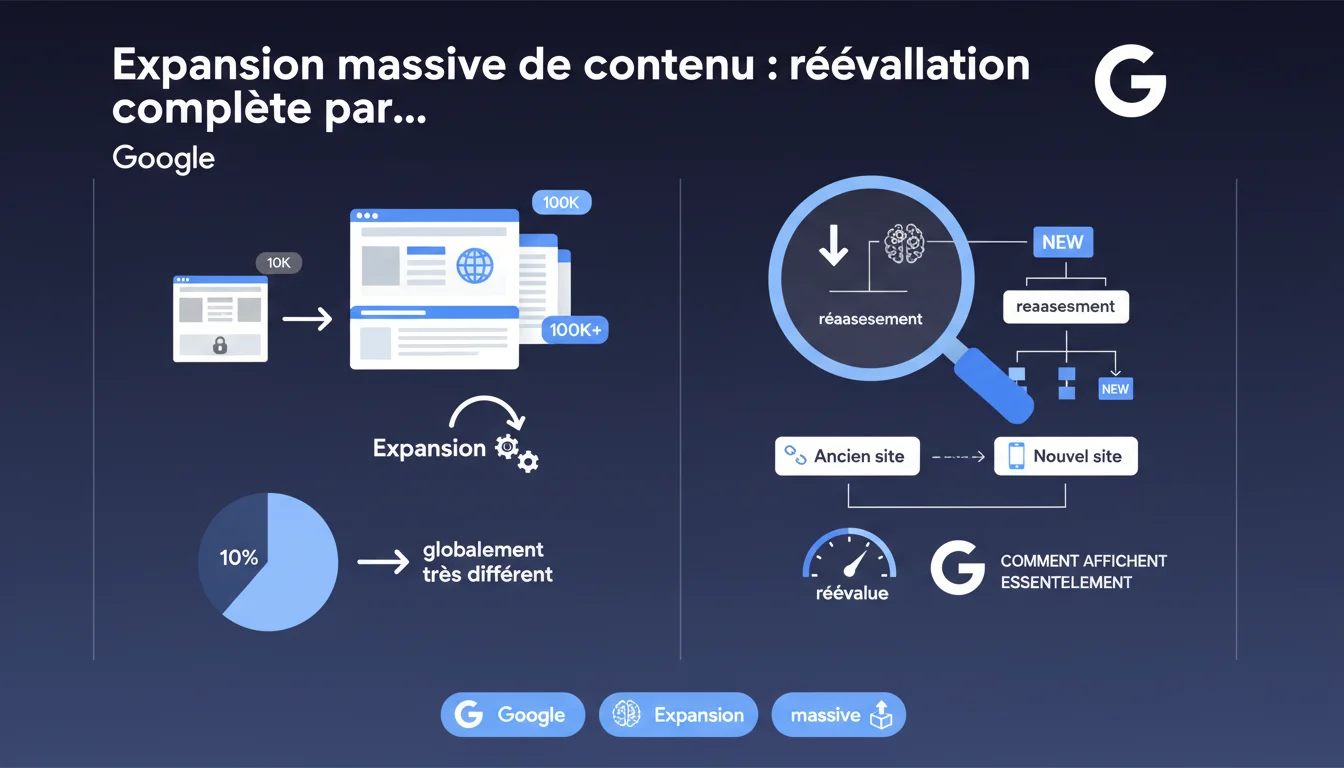 Ce qui était vrai pour 10 000 pages (cohérence éditoriale, profondeur d'expertise) ne s'applique plus mécaniquement à 100 000. Google doit vérifier que cette croissance n'est pas du spam à grande échelle, que les nouvelles sections maintiennent le niveau qualitatif, que l'architecture supporte ce volume.