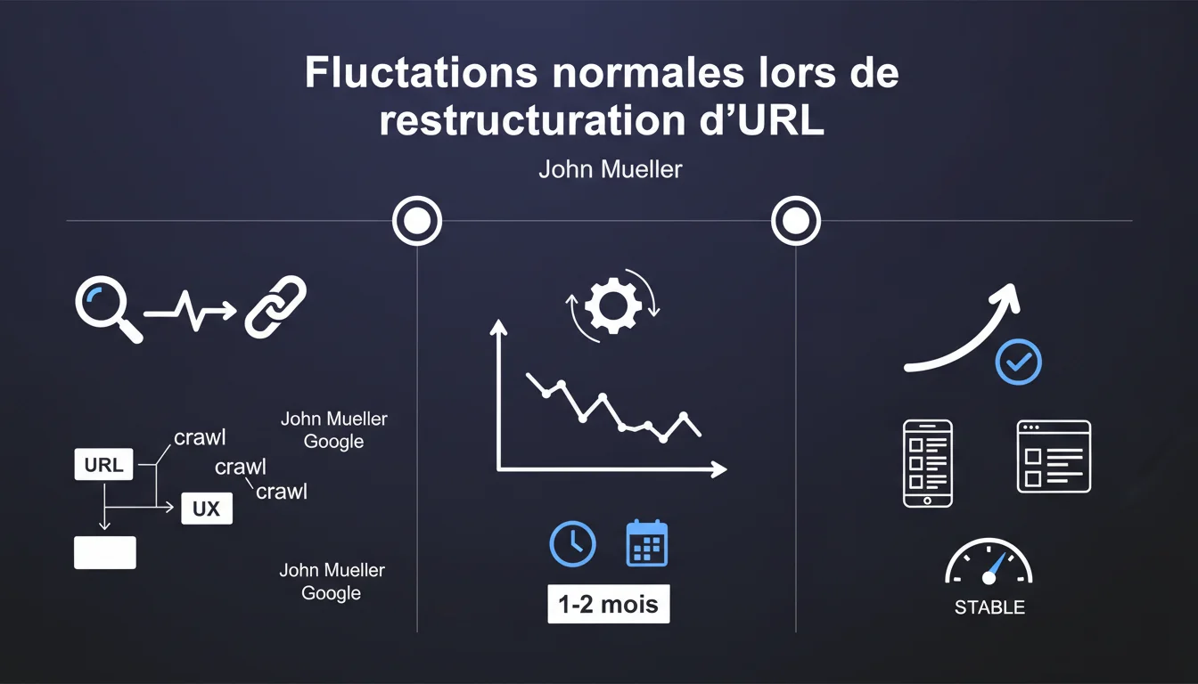 Toute refonte d'architecture d'URL déclenche des fluctuations de positionnement pendant que Google recrawle et réinterprète la nouvelle structure. Ces variations peuvent durer un à deux mois avant stabilisation complète. C'est un processus normal, pas un signal d'alarme.