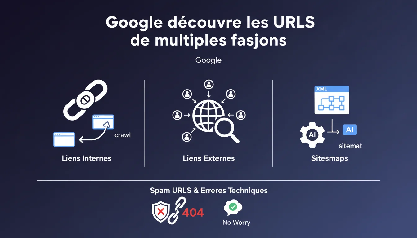 Google crawle les URLs via trois canaux principaux : liens internes, liens externes et sitemaps. Pas besoin de paniquer face aux URLs spam ou techniques que Google détecte, surtout si elles renvoient vers des 404. Le moteur gère lui-même le tri.