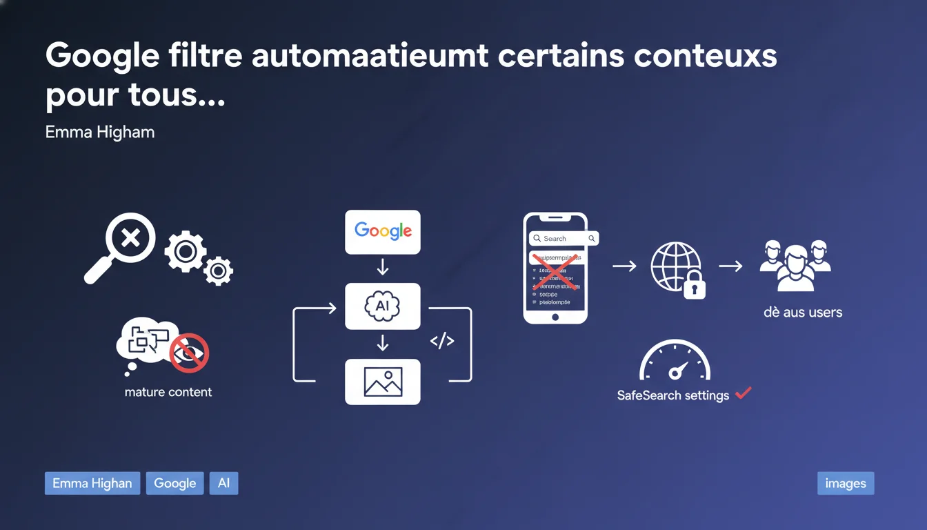 Google applique des filtres automatiques sur les contenus matures dans les images et l'autocomplétion, indépendamment des paramètres SafeSearch de chaque utilisateur. Concrètement, même avec SafeSearch désactivé, certains contenus sont masqués par défaut pour tous. Cette déclaration confirme l'existence d'une couche de filtrage invisible qui s'impose à tous les résultats.