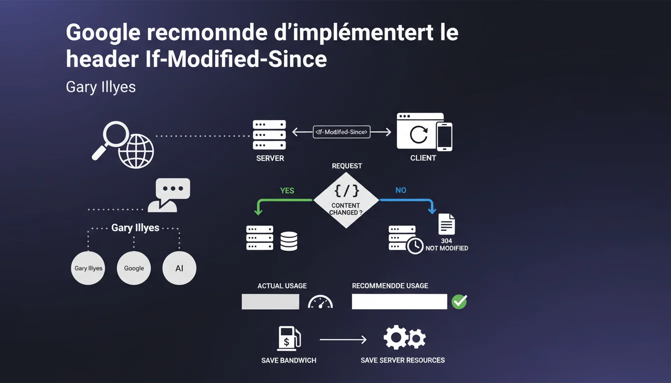 Gary Illyes recommande aux serveurs d'implémenter correctement la réponse 304 Not Modified au header If-Modified-Since. L'objectif : économiser bande passante et ressources serveur en évitant de retransmettre du contenu inchangé. Trop peu de sites exploitent cette fonctionnalité pourtant essentielle pour optimiser le crawl.
