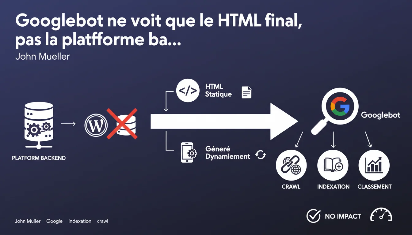 Cette déclaration rappelle un principe fondamental souvent mal compris. Les crawlers n'ont ni accès ni intérêt pour la base de données MySQL, le PHP, les fichiers de configuration ou l'architecture backend. Ils consomment uniquement le document HTML tel qu'il est servi au navigateur.