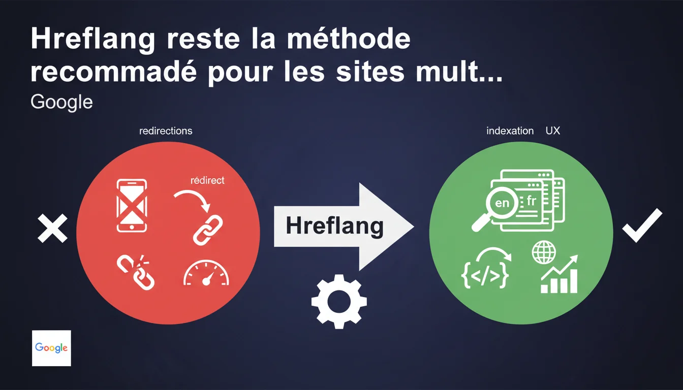 Google réaffirme que le hreflang reste la méthode privilégiée pour gérer les sites multilingues et multirégionaux. Les redirections automatiques basées sur la géolocalisation nuisent à l'indexation des différentes versions linguistiques. Le message est clair : si vous voulez que toutes vos versions soient crawlées et indexées correctement, passez par hreflang.
