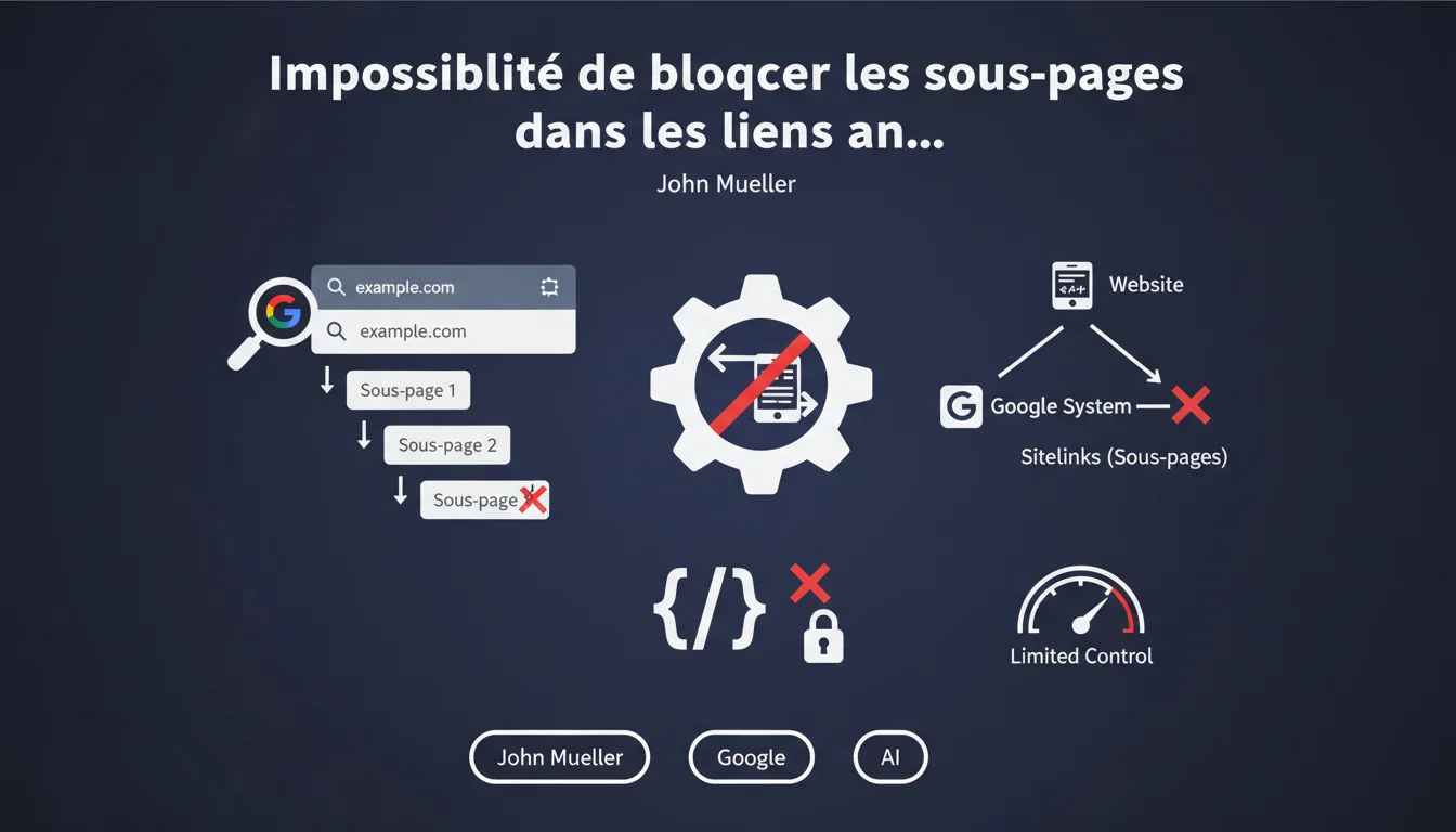 Google ne propose aucun mécanisme pour bloquer une sous-page spécifique des liens annexes (sitelinks). Vous ne pouvez pas empêcher telle ou telle URL d'apparaître sous votre résultat principal. Le contrôle reste entièrement algorithmique, sans levier granulaire côté webmaster.