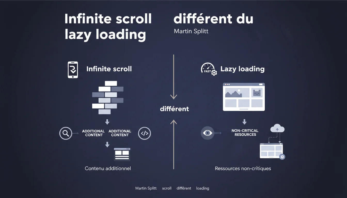 Martin Splitt rappelle que l'infinite scroll et le lazy loading ne sont pas interchangeables. Le lazy loading optimise le chargement d'une page existante en différant les ressources non-critiques, tandis que l'infinite scroll charge du contenu additionnel pour simuler une navigation sans fin. Confondre les deux peut mener à des erreurs d'implémentation catastrophiques pour le crawl et l'indexation.