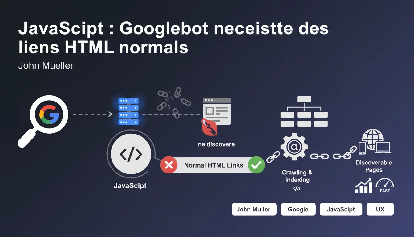 <a>. Si vos liens dépendent d'événements JavaScript sans fallback HTML, une partie de votre site restera invisible. Cette problématique touche autant les SPAs complexes que les sites WordPress mal configurés. L'audit technique est la première étape, mais la mise en conformité peut impliquer des refactorisations profondes — si votre stack technique est complexe ou si vous constatez des pertes d'indexation importantes, un accompagnement par une agence SEO spécialisée dans le JavaScript SEO peut vous faire gagner des mois et éviter des erreurs coûteuses.❓ Questions frequentes