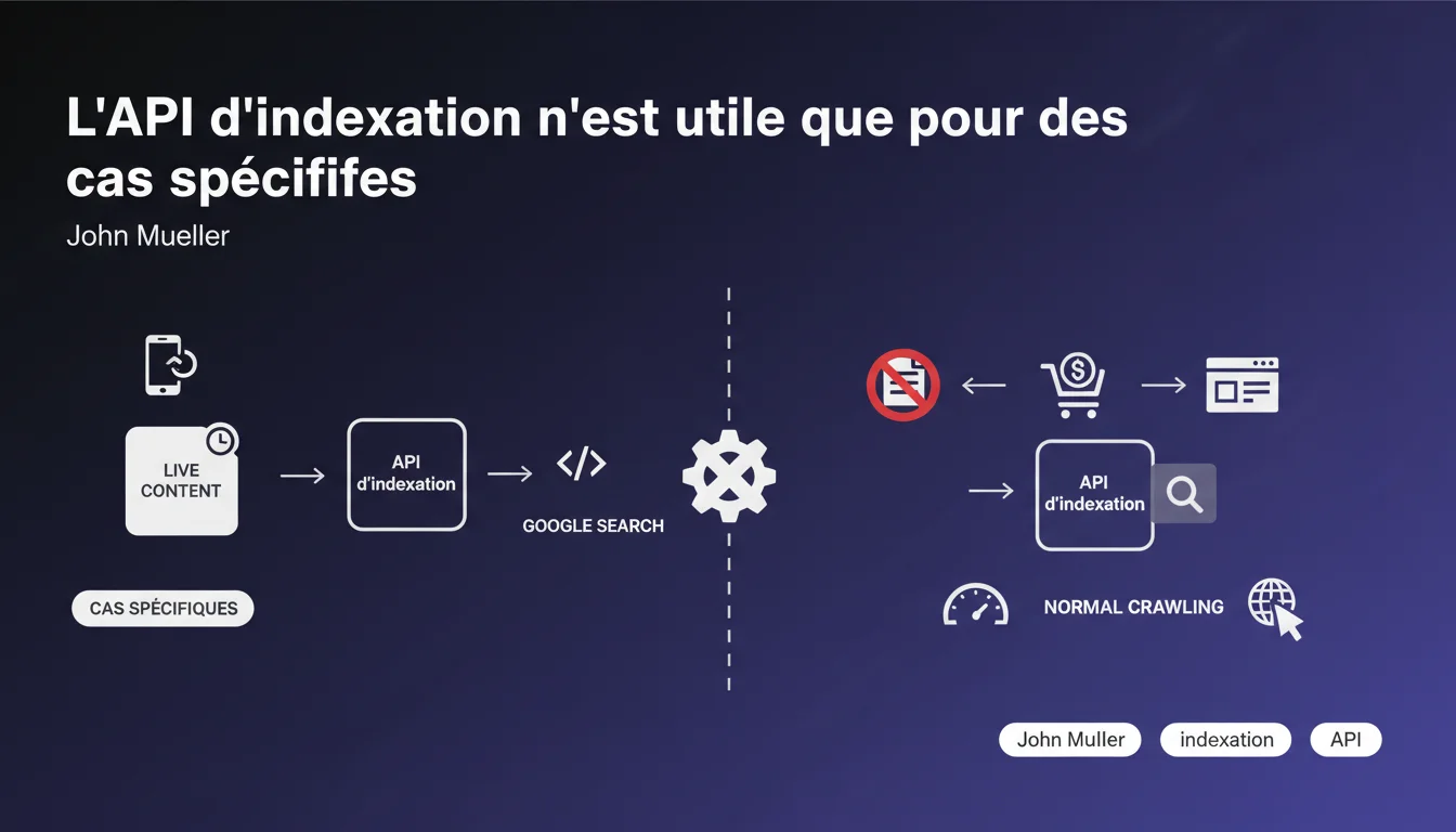 L'API d'indexation de Google n'est pertinente que pour des types de contenus très spécifiques. L'utiliser pour d'autres contenus n'apporte aucun bénéfice tangible, même si cela ne cause pas de problème technique. Mueller confirme qu'il s'agit d'un outil de niche, pas d'un levier d'indexation universel.