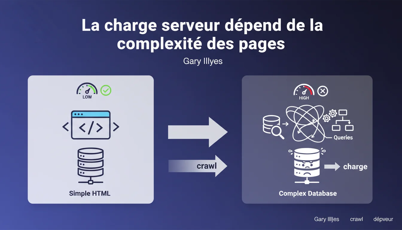 Gary Illyes rappelle que l'impact du crawl sur vos serveurs dépend avant tout de votre stack technique. Des requêtes SQL complexes ou des opérations coûteuses génèrent une charge bien plus importante qu'un site HTML statique, même avec un volume de crawl identique. Le crawl budget n'est pas qu'une histoire de quotas — c'est aussi une question de performance infrastructure.
