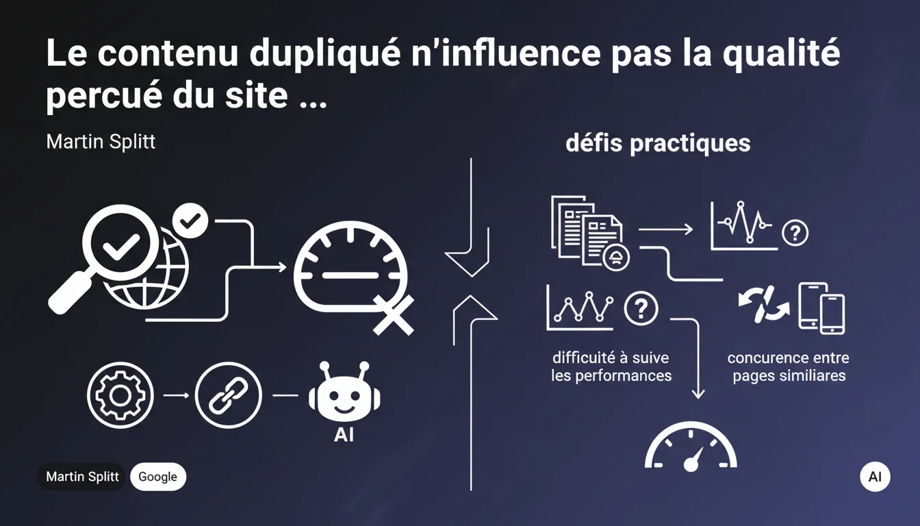 Google affirme que le contenu dupliqué n'affecte pas négativement la perception de qualité d'un site ni son classement. En revanche, il complique le suivi des performances et crée une cannibalisation entre pages similaires qui peut diluer votre visibilité.