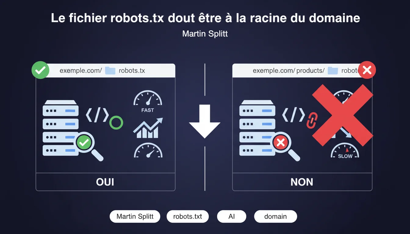 Le fichier robots.txt doit impérativement être à la racine du domaine (exemple.com/robots.txt). Tout autre emplacement, y compris dans un sous-répertoire, rendra le fichier invisible pour les moteurs de recherche. Cette règle technique ne souffre aucune exception.