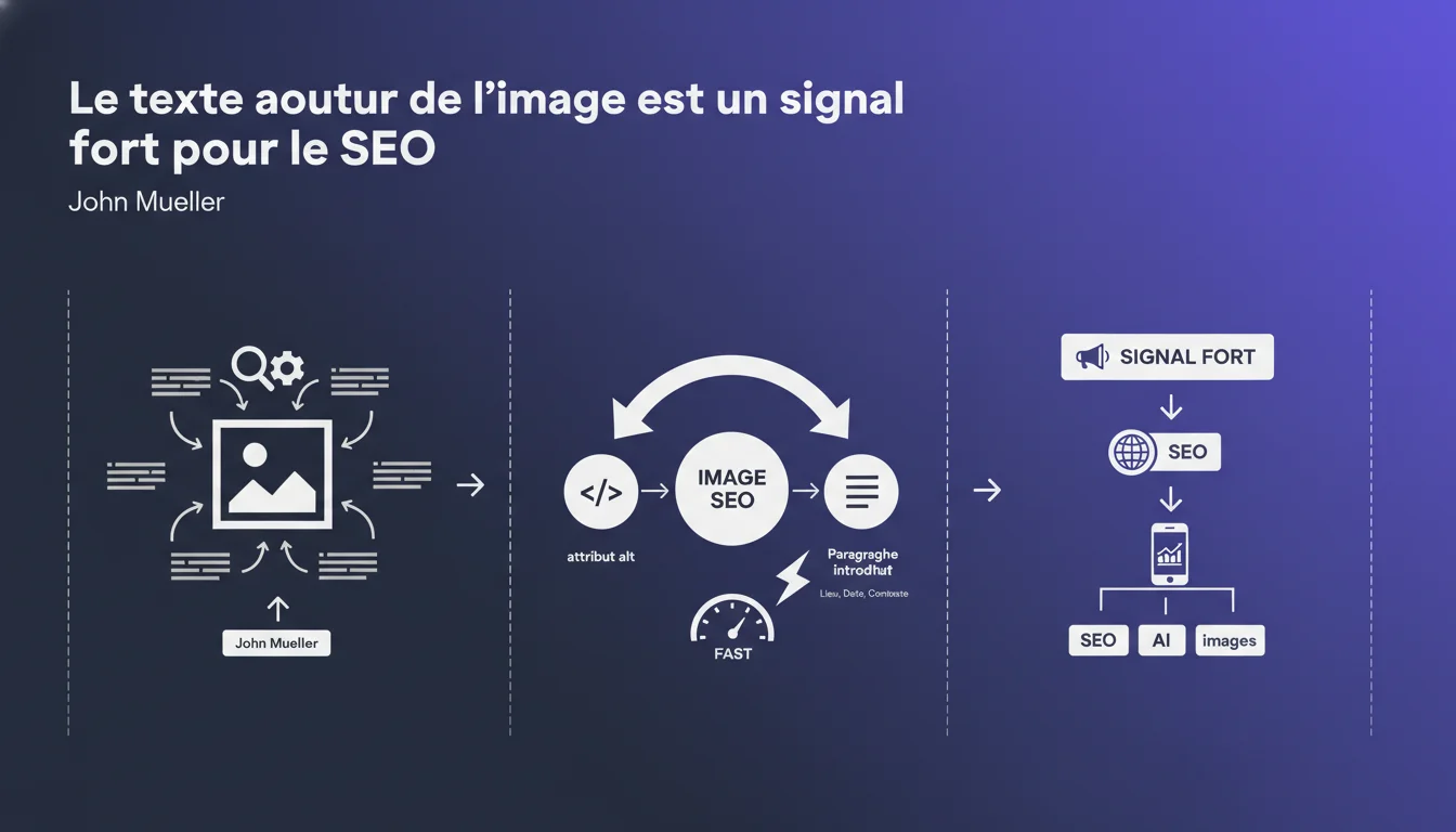 [À vérifier] Mueller ne quantifie pas le poids relatif : le texte contextuel pèse-t-il 60 % vs 40 % pour l'alt ? 80/20 ? Impossible à dire. Les tests A/B sur ce point donnent des résultats variables selon les verticales (actualité, e-commerce, blog).