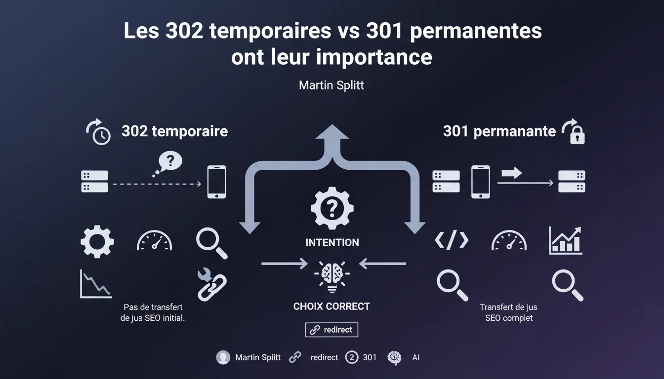 Martin Splitt confirme que le choix entre une redirection 301 (permanente) et 302 (temporaire) n'est pas anodin pour Google. Le type de redirection sélectionné doit correspondre à l'intention réelle : si le déplacement est définitif, une 301 s'impose ; si c'est provisoire, une 302 est appropriée. Une mauvaise implémentation peut impacter le transfert de signaux et la façon dont Google traite les URLs.