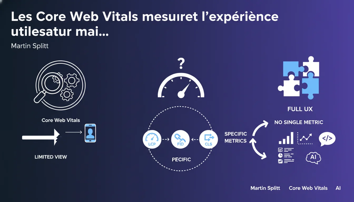 Google confirme que les Core Web Vitals ne capturent qu'une fraction de l'expérience utilisateur réelle. Aucune métrique unique ne peut couvrir tous les aspects de l'UX, d'où la multiplication des indicateurs spécifiques. Pour les praticiens SEO, cela signifie qu'optimiser uniquement LCP, FID et CLS ne garantit pas une expérience optimale.