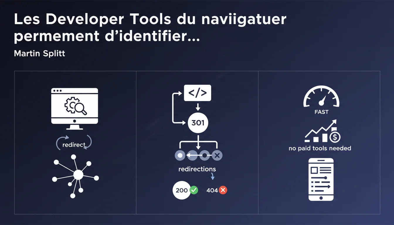 Martin Splitt rappelle que l'onglet Network des Developer Tools intégrés à Chrome, Firefox ou Safari affiche tous les codes HTTP (301, 302, 404, 200…) et permet d'identifier les chaînes de redirections sans dépendre d'outils payants. Un rappel simple mais utile pour diagnostiquer rapidement un problème de redirection, même si la méthode reste manuelle et peu scalable pour un audit complet.