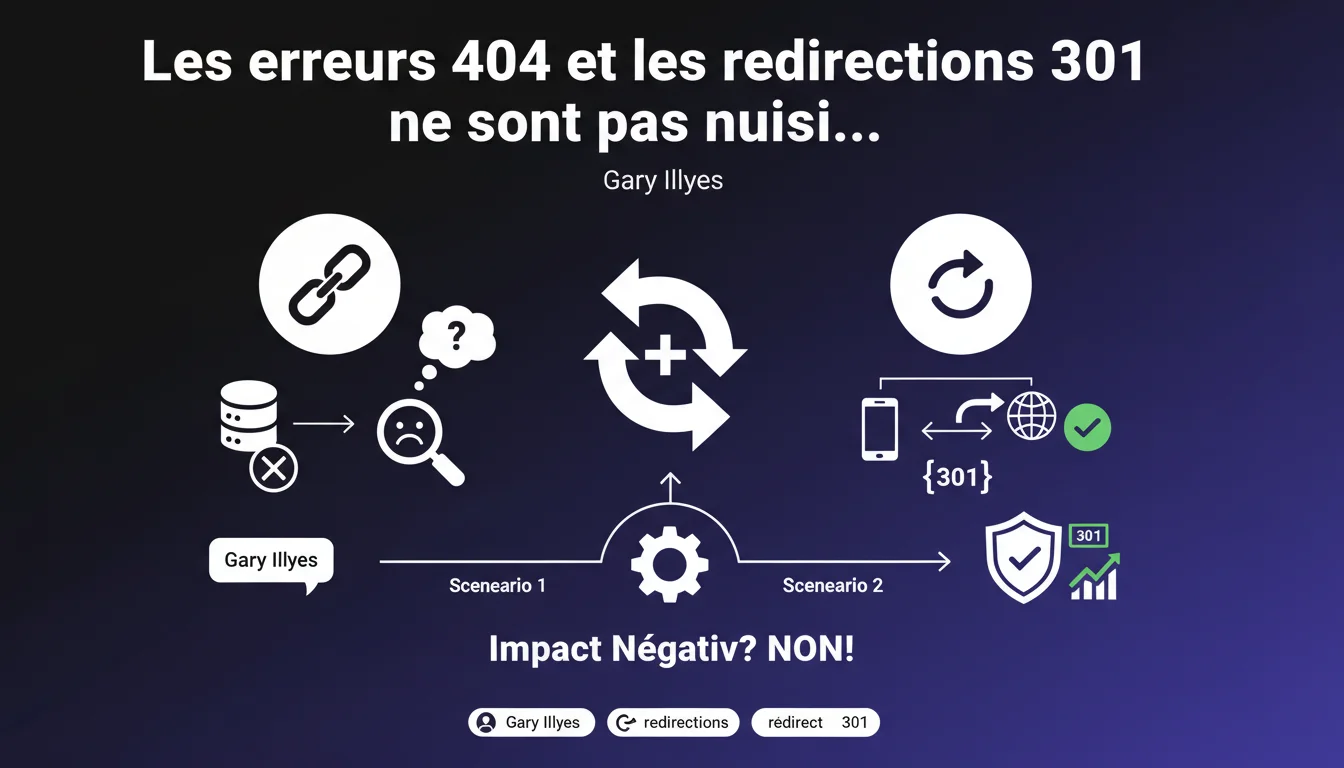 Illyes ne dit pas que les 404 et les 301 sont sans conséquence — il dit qu'elles ne sont pas pénalisantes d'un point de vue algorithmique. Nuance importante.