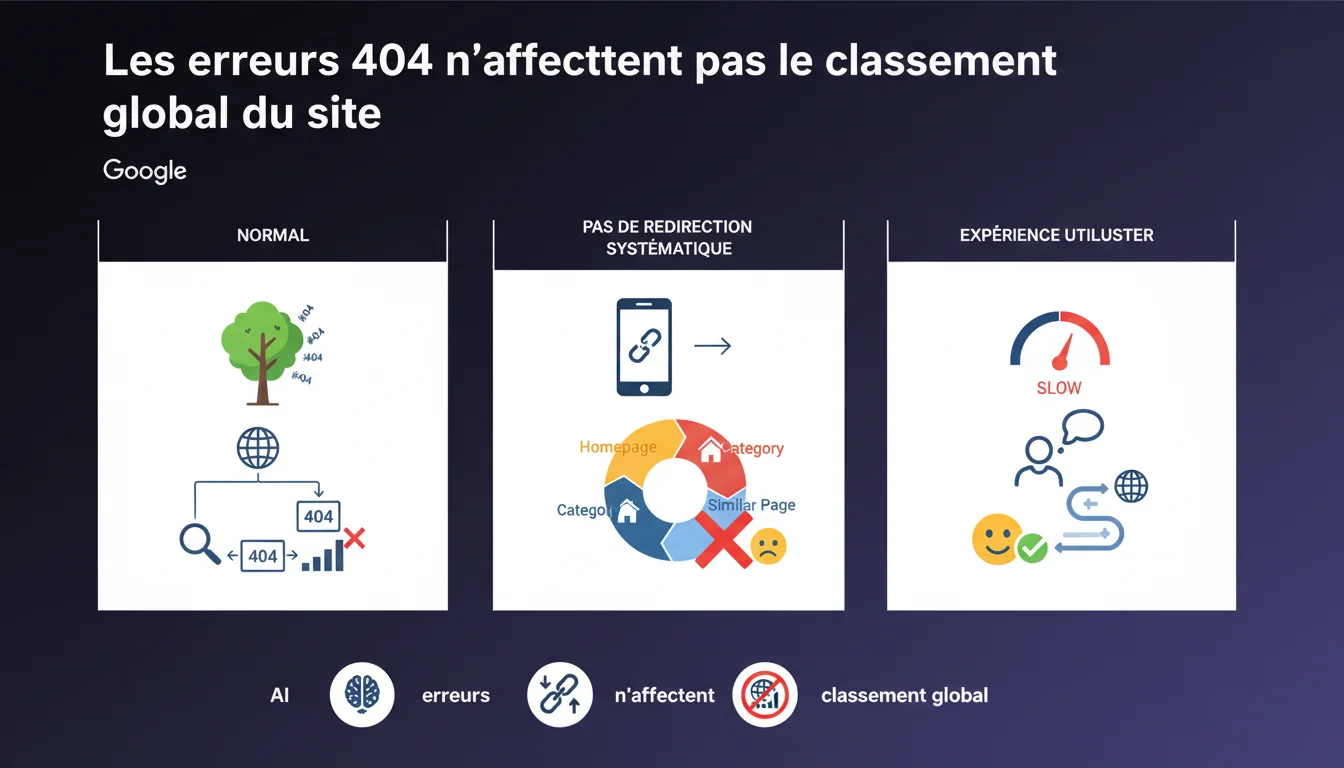 Google affirme que les erreurs 404 n'impactent pas le classement global d'un site et font partie de son fonctionnement normal. Rediriger systématiquement ces pages vers l'accueil ou des catégories dégrade l'expérience utilisateur plutôt que de la protéger. La vraie question : jusqu'où cette règle s'applique-t-elle sans nuances ?