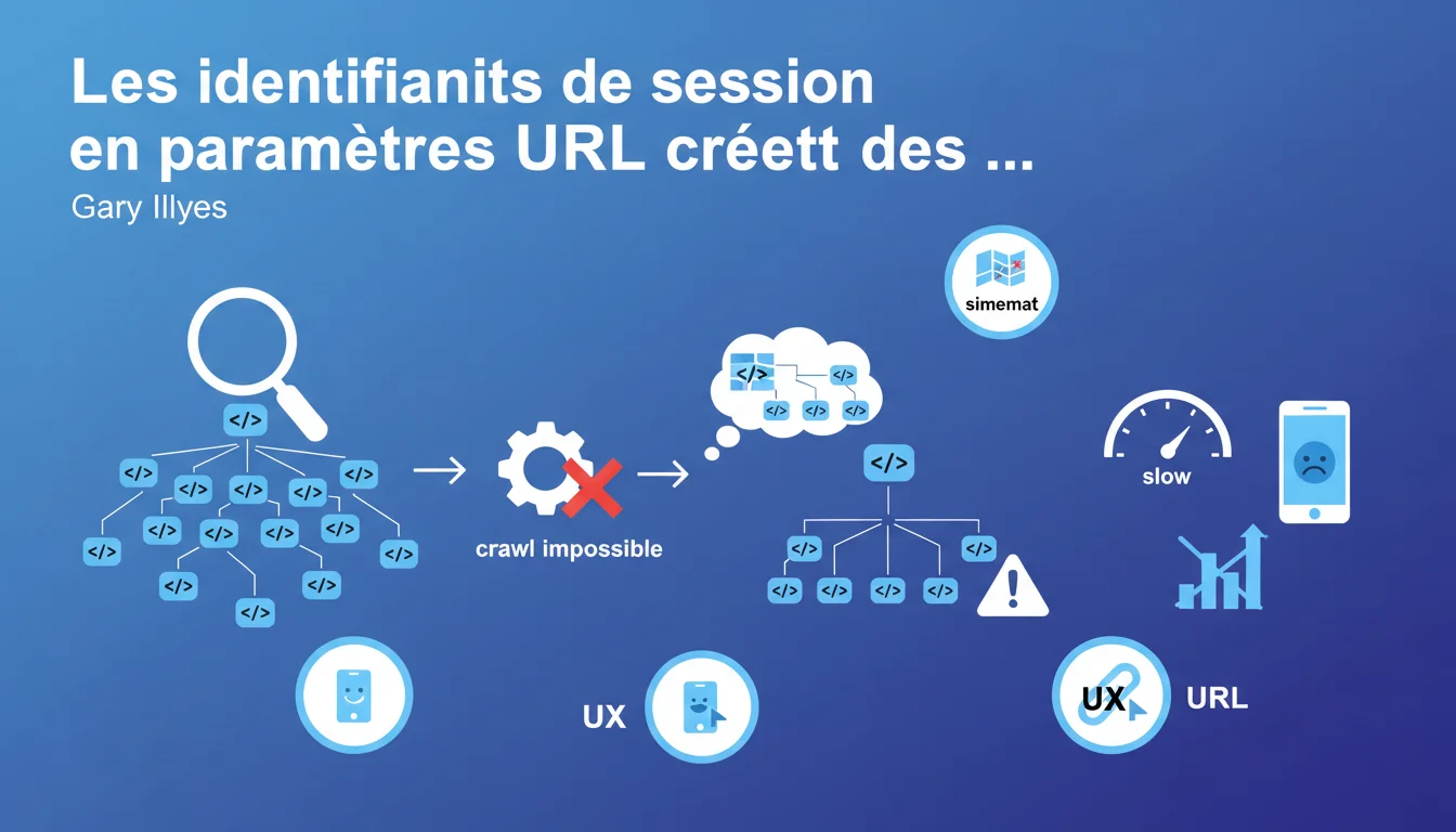 Les identifiants de session passés en paramètres d'URL génèrent un nombre quasi-infini d'URLs distinctes, rendant le crawl par les moteurs impossible. Ce problème, massif dans les années 2000, continue d'impacter certains sites — souvent révélé uniquement lors de la création d'un sitemap. La solution : gestion des sessions par cookies ou paramètres URL configurés dans Search Console.