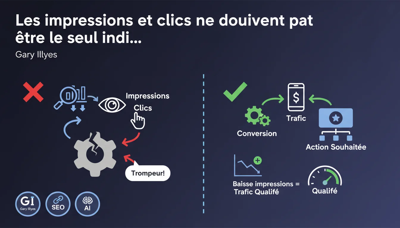 Gary Illyes rappelle que les impressions et clics ne sont que des métriques de surface. Ce qui compte vraiment, c'est la conversion et l'accomplissement des objectifs utilisateurs. Une baisse d'impressions peut même être bénéfique si elle filtre le trafic non qualifié.