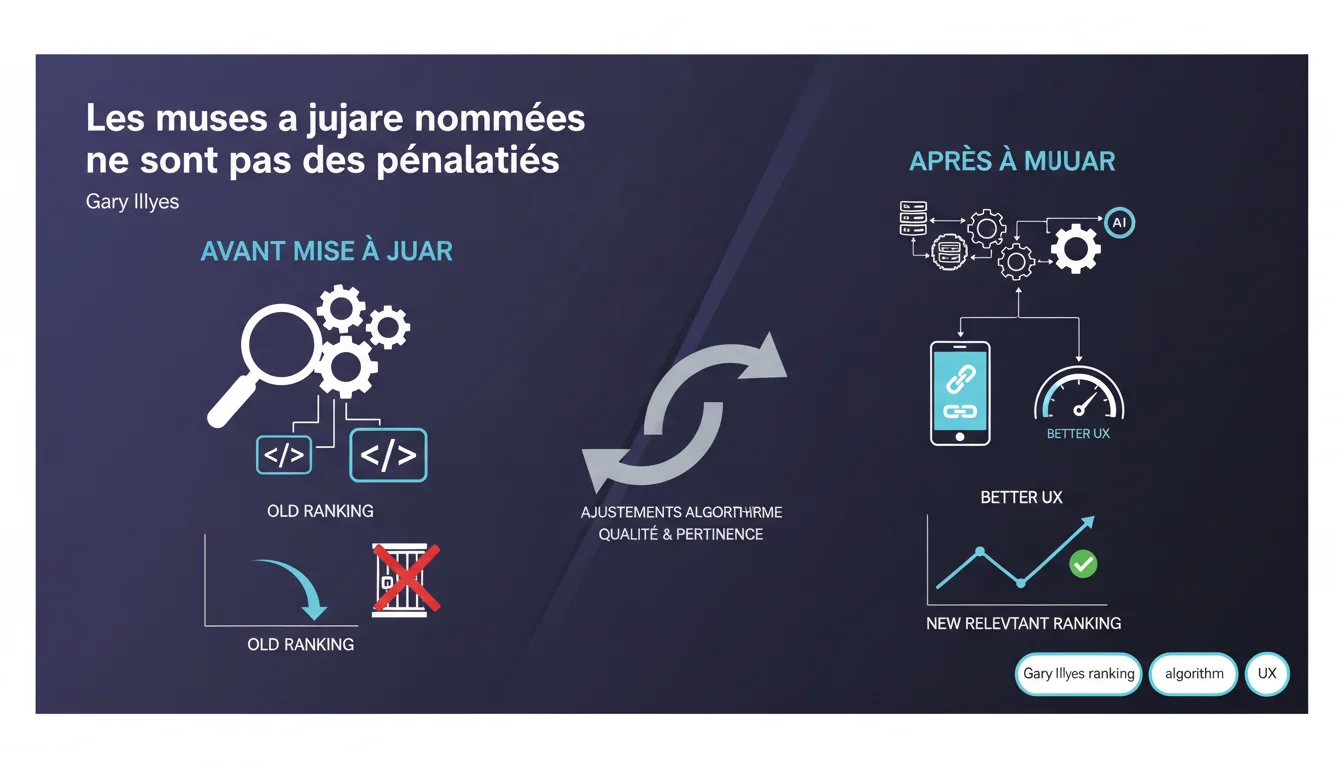 Une mise à jour algorithmique, selon Gary Illyes, réajuste les critères de qualité et de pertinence. Votre site n'a rien violé — il est juste devenu moins compétitif face aux nouveaux standards. C'est l'algorithme qui évolue, pas vous qui êtes sanctionné.