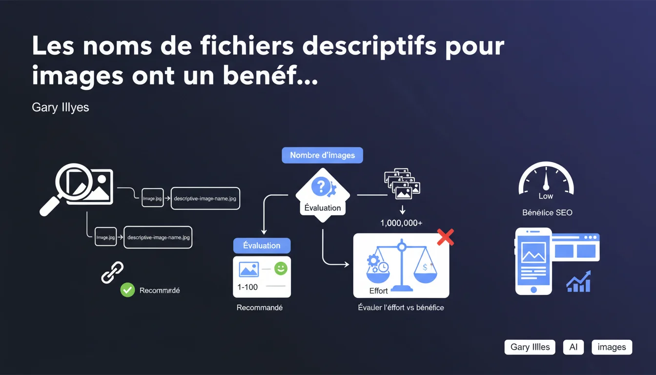 Gary Illyes confirme que les noms de fichiers descriptifs pour les images apportent un bénéfice SEO, mais qualifie cet impact de « limité ». Sur des catalogues de millions d'images, Google suggère d'évaluer si le ROI justifie l'effort de renommage systématique — ce qui sous-entend que d'autres optimisations peuvent être prioritaires.