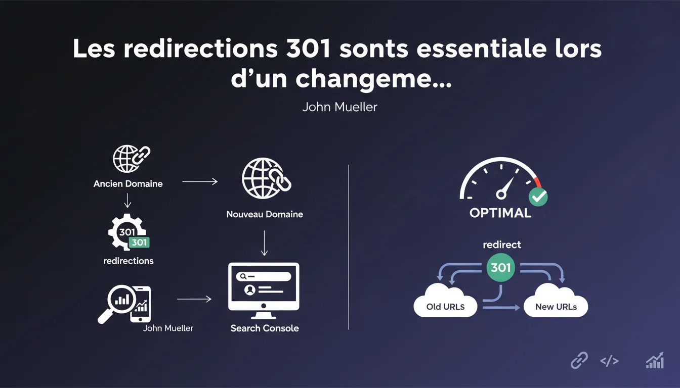 John Mueller rappelle que lors d'un changement de domaine, l'élément critique reste la mise en place de redirections 301 de toutes les anciennes URLs vers les nouvelles. La validation du nouveau domaine dans Search Console arrive en second plan, mais ne remplace jamais une stratégie de redirection propre.