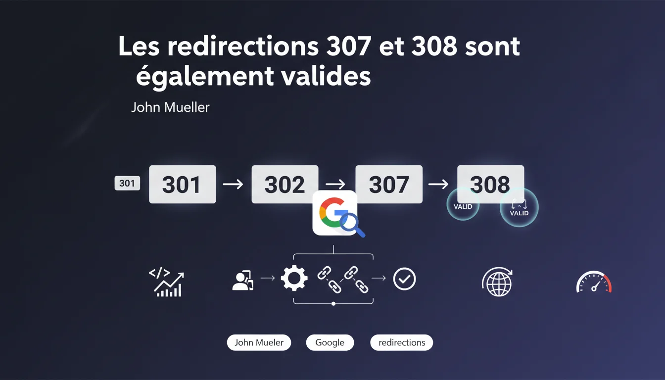 Google confirme que les redirections 307 et 308 sont traitées au même titre que les 301 et 302 par son moteur de recherche. Tous ces types de redirections HTTP sont officiellement pris en charge. Le choix entre ces options dépend désormais de vos besoins techniques spécifiques, pas de contraintes SEO.
