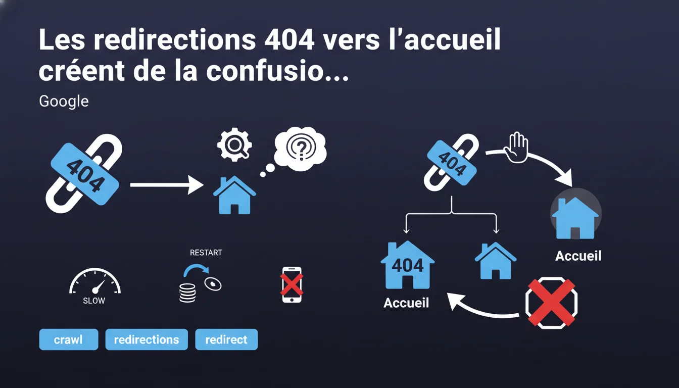 Google déconseille de rediriger automatiquement les pages 404 vers la page d'accueil. Cette pratique force le crawler à repartir de zéro et gaspille le crawl budget inutilement. Mieux vaut servir une vraie 404 ou proposer une redirection contextuelle vers une page pertinente.