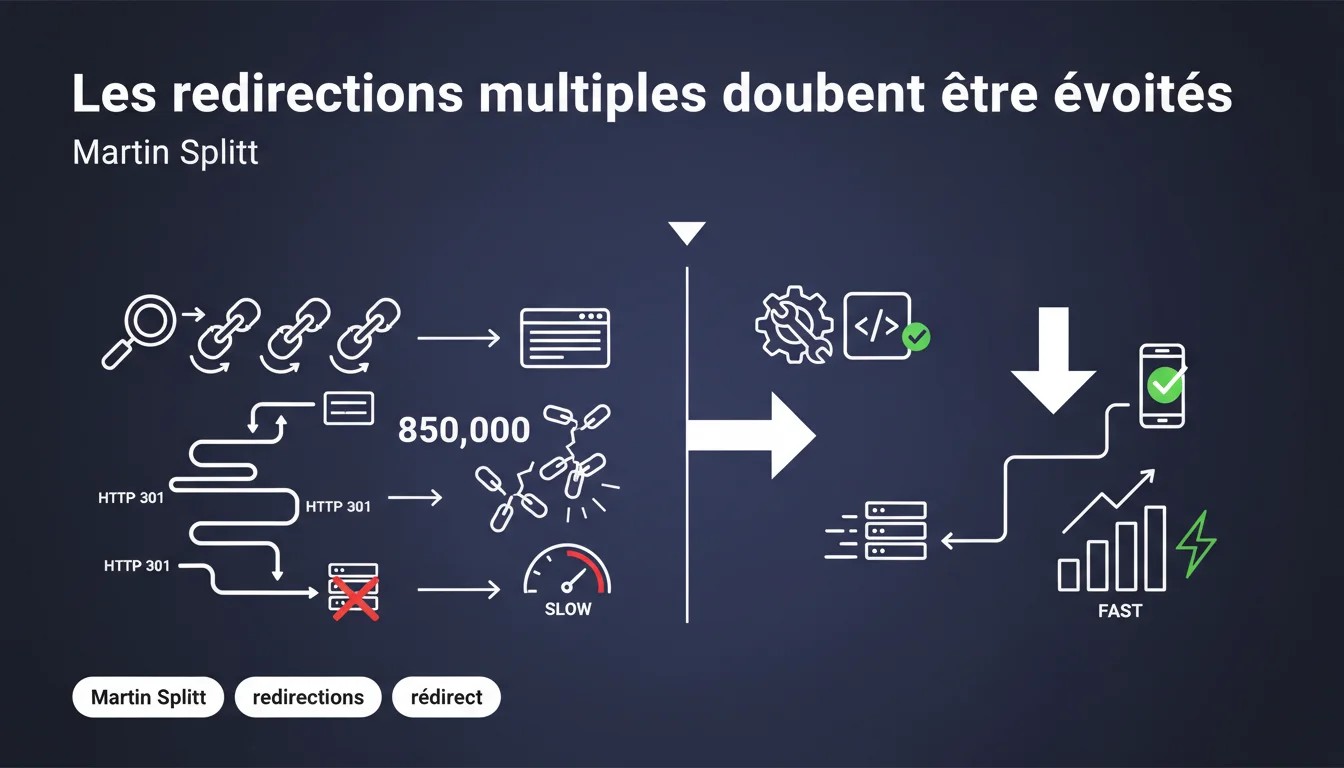 Google confirme officiellement que les chaînes de redirections multiples posent problème. L'exemple cité — 850 000 pages avec des redirections en cascade — illustre un cas concret où ces configurations impactent négativement les performances techniques. Concrètement : nettoyez vos redirections et évitez d'empiler 301 sur 301.