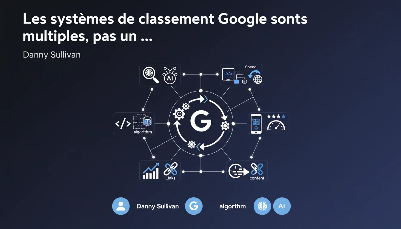 La terminologie compte. Quand on parle d'« algorithme Google », on imagine un mécanisme unique et centralisé. La réalité est bien plus fragmentée : Google mobilise des dizaines de systèmes de classement indépendants, chacun analysant une facette différente d'une page ou d'un site.