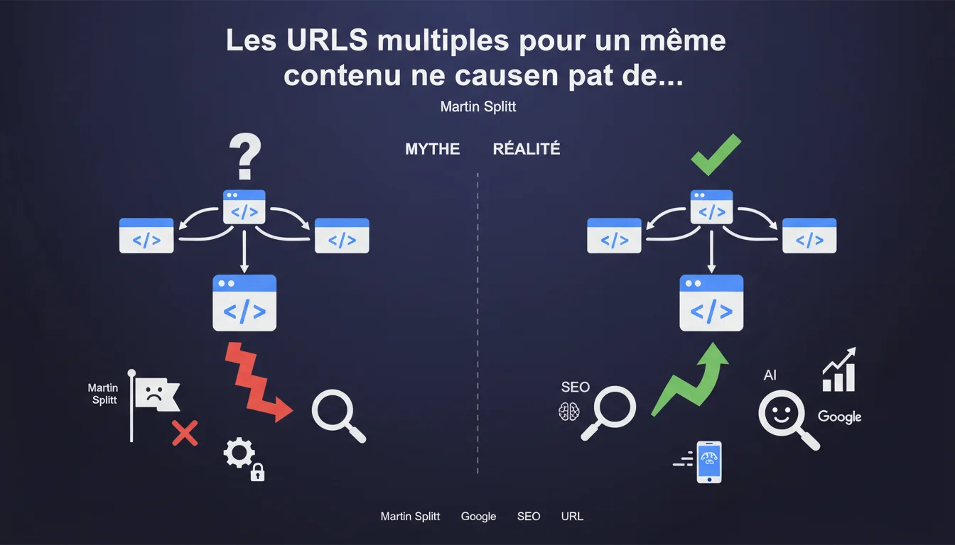 Martin Splitt balaie l'idée reçue : avoir plusieurs URLs pointant vers le même contenu ne déclenche aucune pénalité Google. C'est un mythe tenace que les SEO devraient abandonner. Google gère ces doublons via la canonicalisation, sans sanctionner le site.