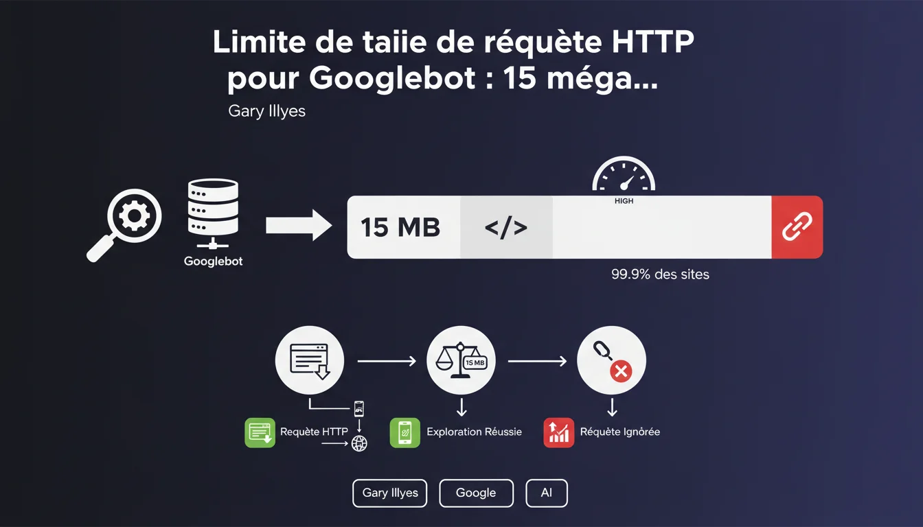 Google ne crawle que les 15 premiers mégaoctets d'un fichier HTML. Si votre page dépasse cette taille, tout ce qui suit est ignoré : liens, contenu, balises structurées. C'est un point de coupure net.