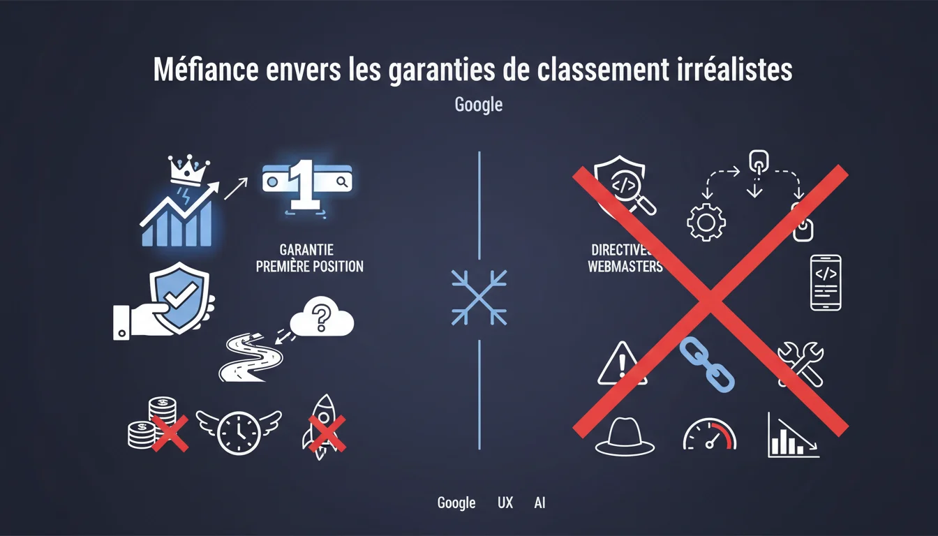 Le message est clair — les garanties de position sont un red flag. Les prestataires sérieux parlent d'objectifs mesurables (trafic, conversions, visibilité sur un panier de mots-clés), jamais de promesses absolues sur des positions.