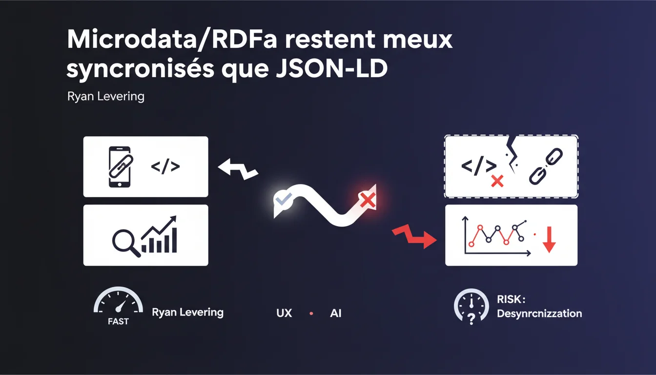 Google reconnait que Microdata et RDFa restent mieux synchronisés avec le contenu visible que JSON-LD. Le JSON-LD, plus simple à implémenter, présente un risque accru de désynchronisation entre les données structurées et le contenu réellement affiché. Un aveu qui remet en perspective les recommandations officielles favorisant pourtant JSON-LD depuis des années.