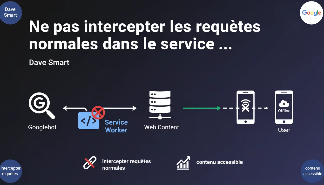 Le problème survient lorsque vous interceptez les requêtes normales (fetch events) uniquement pour des fonctionnalités offline, sans prévoir de fallback côté serveur. Concrètement : si le contenu n'existe que dans le cache du service worker et qu'aucune réponse HTTP classique n'est disponible, Googlebot est bloqué.