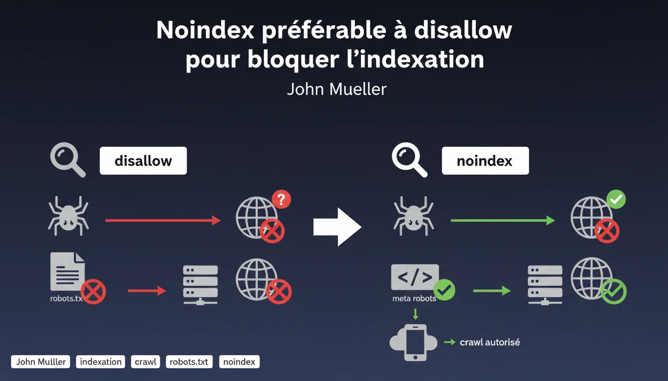 Google recommande explicitement d'utiliser noindex plutôt que disallow dans robots.txt pour bloquer l'indexation. La distinction est cruciale : disallow empêche le crawl, donc Google ne peut pas lire la balise noindex. Pour que noindex fonctionne, vous devez autoriser l'accès des robots à la page.