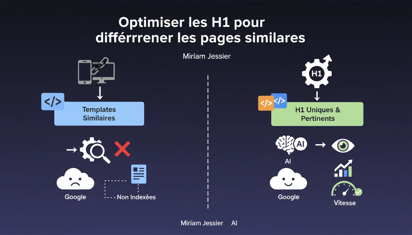 Google recommande d'optimiser les H1 pour les rendre significatifs et distincts lorsque des pages avec templates similaires ne sont pas indexées. L'algorithme peut percevoir des pages comme identiques si leurs éléments structurants (notamment les H1) sont trop semblables. La première action corrective consiste à différencier ces titres principaux pour clarifier la singularité de chaque page.