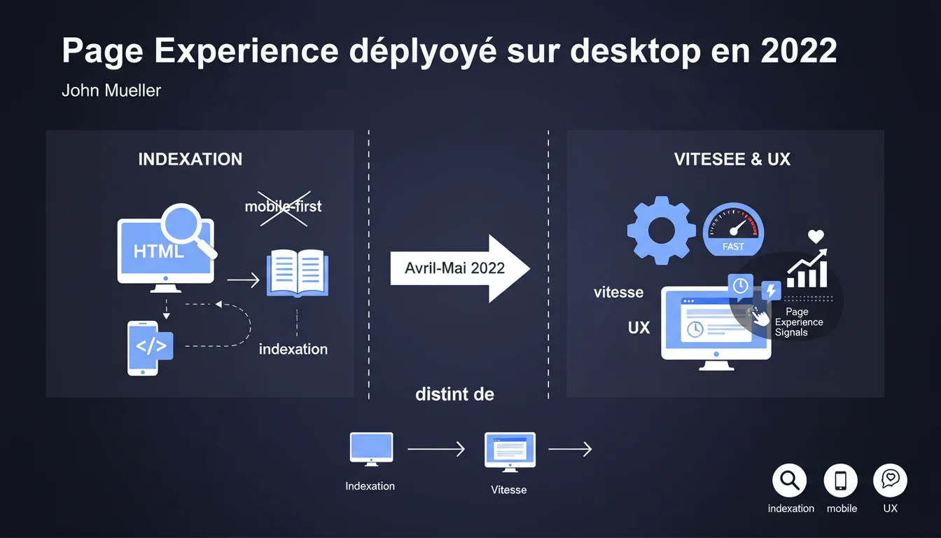 Ce déploiement ne modifie pas la manière dont Google indexe vos pages desktop. Il ajoute simplement une couche d'évaluation de l'expérience utilisateur dans le classement des résultats de recherche effectués depuis un ordinateur.