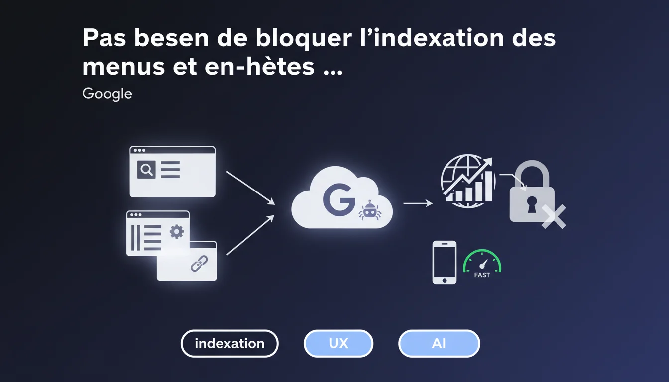 Google affirme qu'il n'est pas nécessaire de bloquer l'indexation des en-têtes, menus, barres latérales ou pieds de page. Les moteurs gèrent le web tel qu'il est, y compris les mega menus volumineux. Cette position invite à reconsidérer certaines pratiques d'obfuscation technique encore répandues.