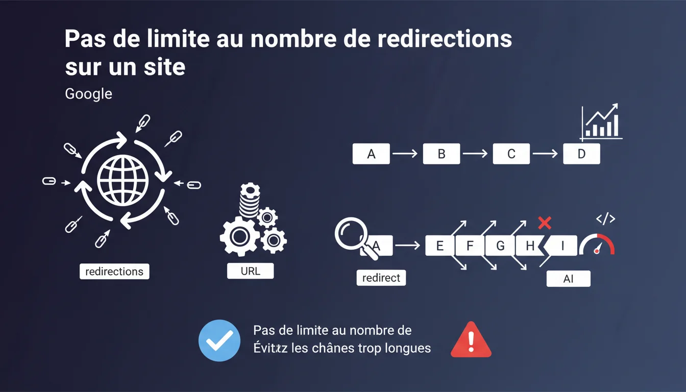 Google affirme qu'il n'y a pas de limite globale au nombre de redirections sur un site. La seule contrainte concerne les chaînes de redirection individuelles : évitez trop de sauts successifs pour une même URL. Distinction claire entre volume total et profondeur des chaînes.