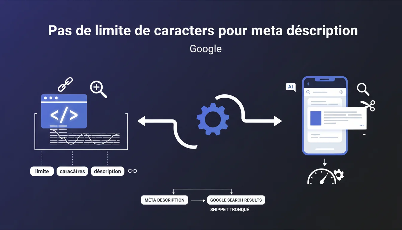 Google confirme qu'aucune limite technique de caractères n'existe pour les meta descriptions. Les snippets affichés dans les résultats de recherche sont tronqués selon l'espace disponible, ce qui varie selon les contextes (desktop, mobile, featured snippets). La longueur optimale reste donc empirique, pas absolue.